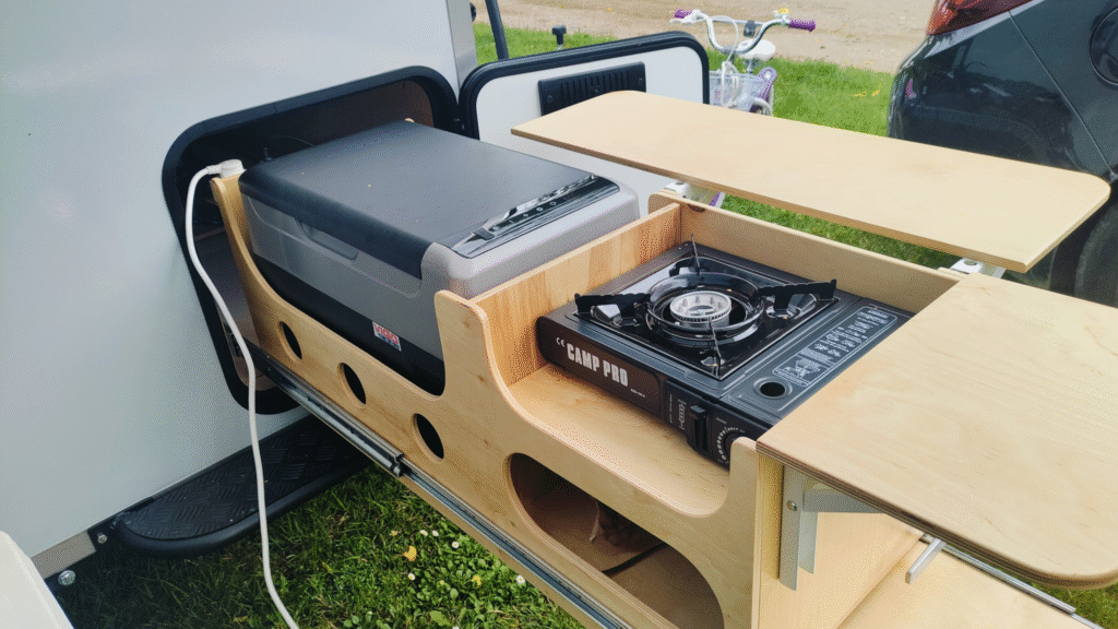 - Kuchnia wysuwana (lodówka, palnik gazowy, 3x blat roboczy, zabudowana półka)