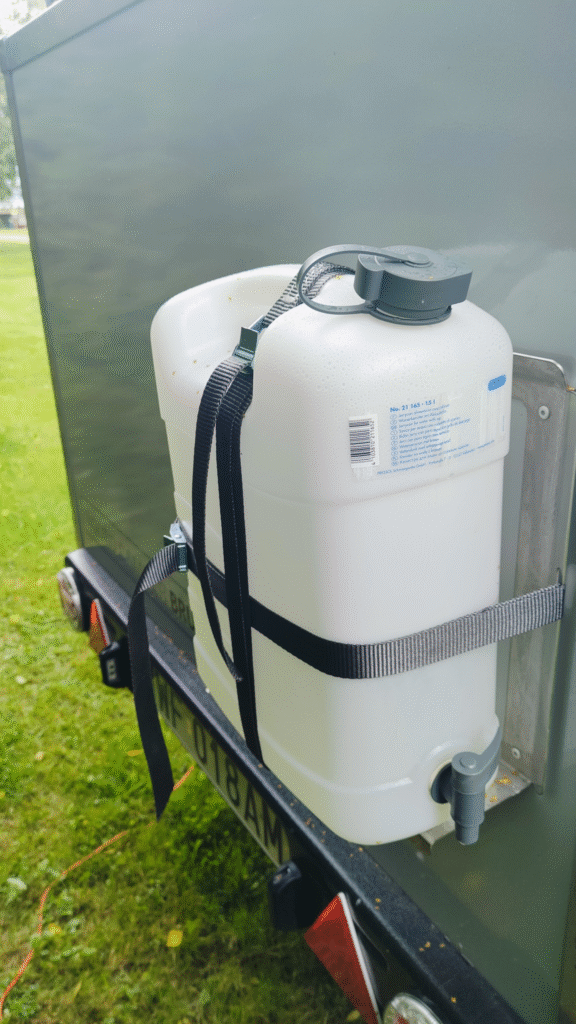 - Kanister na wodę (10l łatwo przenieść w nim wodę a podręczna czysta woda przydaję się do przemycia rąk, czy naczyń – idealna sprawa 🙂