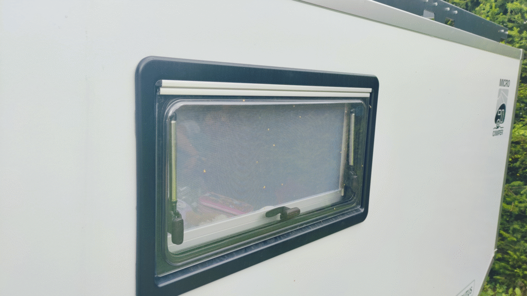 - Duże okna wraz z zasłonką i moskitierą (wpuścisz wieczorem przyjemne powietrze ale bez komarów czy innych latających stworów.